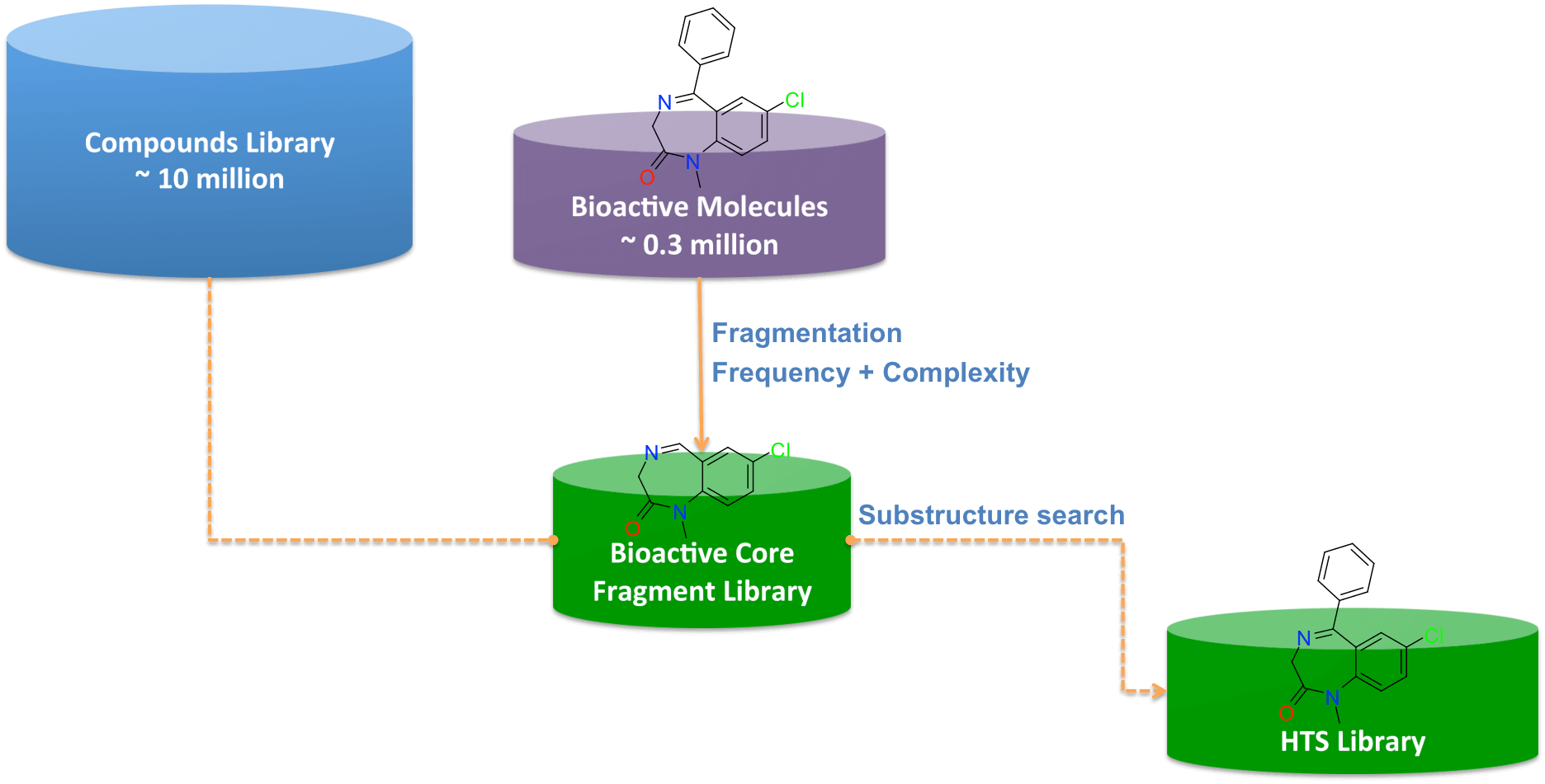 Navigation through the enormous chemical space of small molecules to locate bioactives is not that different from finding an earth in the endless universe. Focusing on bioactive core fragments, it is possible to generate a special fragment library for the increasingly popular fragment-based drug design (FBDD), and ultimately high-throughput screening (HTS) libraries. The cheminformatics approach can be further applied to eliminate non-druggable compounds such as those with reactive moieties frequently known as PAINS.